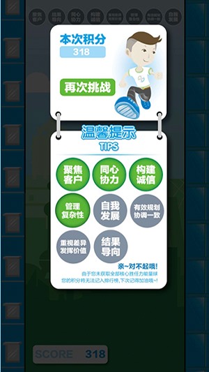 整个H5采用的是扁平卡通风格,容合了企业的核心胜任力内容,让用户在游戏过程中深刻认识本公司的核心胜任力。