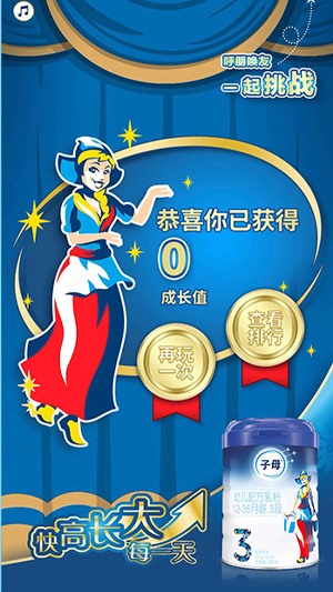 首页是一位女性卡通形像加上本品牌的奶粉,点击进入游戏后便 进入了游戏页面,在初次游戏时会出现新手引导,游戏采用引导卡通奶牛跳跃的方式 收集能量,每收 集一个能量便会出现一个相应的品牌优势,收集完四种能量后便可结束游戏,游戏结算页可以查看分数及排行,并可分享给朋友与朋友一起PK。本游戏的难度中等又 有一定的竞技,可以说是很好的休闲小游戏。